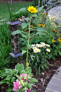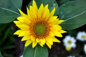It was a hot afternoon, in the sweltering sun, when this mysterious plant made its debut. It was indeed, not a weed, rather – a sunflower! How in the world? In my flowerbed are black-eyed susans, daisies, and assorted flowers and foliage I planted by hand. I did not plant any sunflowers. It’s not the right place for them. They need lots of space and tons of sun. This little guy was wedged in between plants and only received partial sun. Nonetheless, there stood, in my flowerbed, a sunflower – perfect in every way. I laughed to myself when I realized what happened. At some point, a whole sunflower kernel had been knocked off the bird feeder (by a menacing squirrel, no doubt), and it germinated and produced a spectacular specimen. Wow.