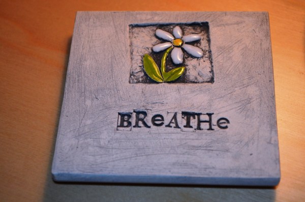 Once upon a time, I went to my doctor because I kept getting a tingling sensation in my hands. Her solution was simple…breathe. I guess when life gets its panties in a wad, I forget to breathe properly. Later, this little gem was discovered in a small store and knew it was a perfect reminder!