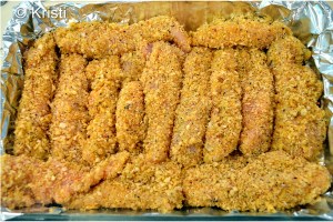 Here, the chicken is raw. I put the chicken strips in a slightly greased 9×13 dish so they are close together and won’t dry out in the oven.
