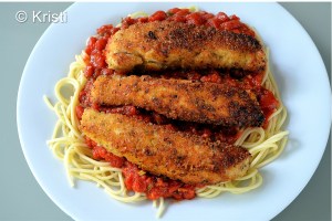 #2 – Speaking of crunch, the reason why I cut the chicken into strips is the crunch to chicken ratio. I could’ve left the chicken breast whole, but for one, that’s a lot of chicken!, and two, there isn’t much crunch. Cutting it into strips makes the chicken go farther (yeah! economical!) and there is more panko to enjoy. All this talk is making me hungry, so let’s get to it!