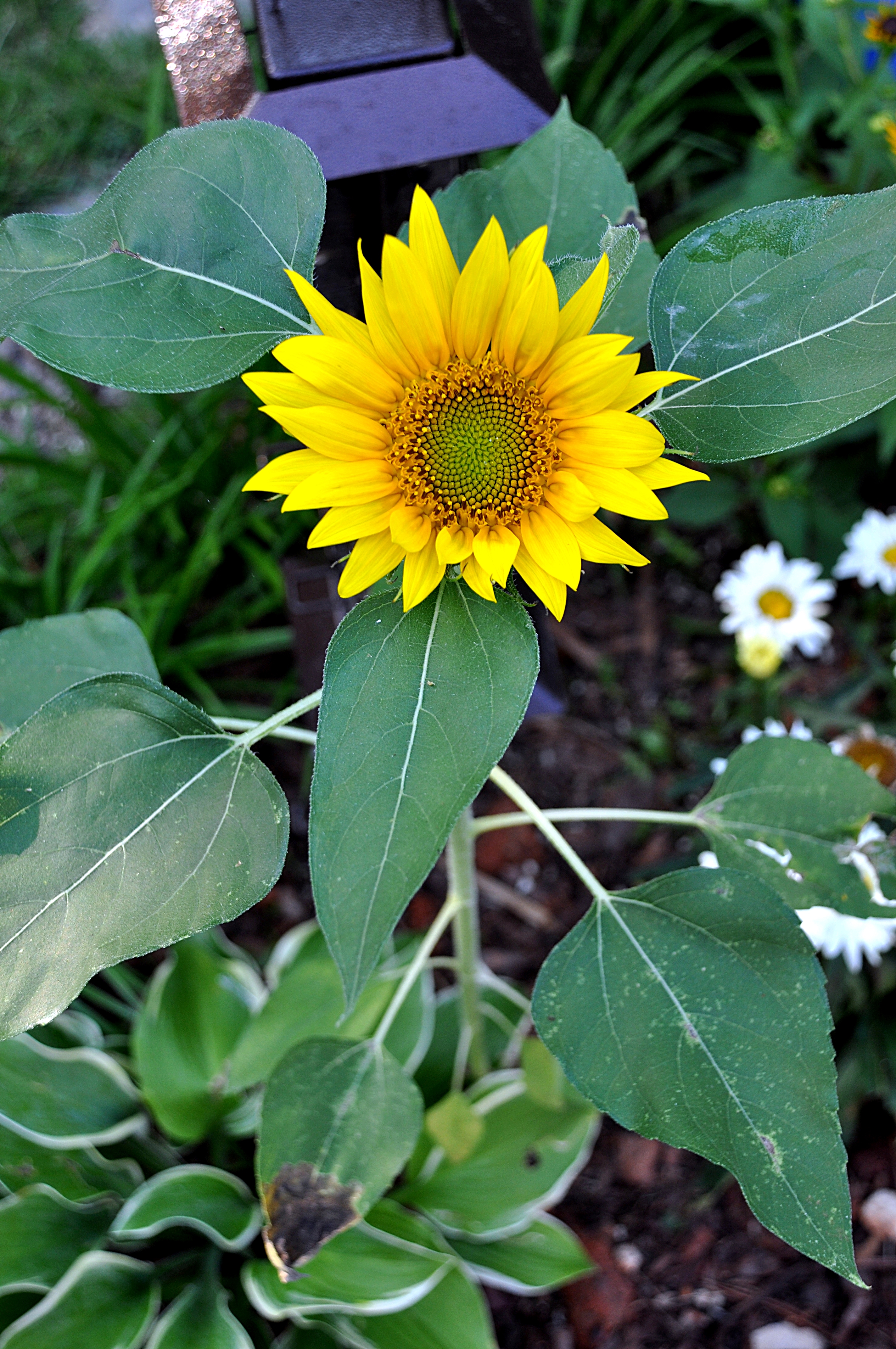 It was a hot afternoon, in the sweltering sun, when this mysterious plant made its debut.  It was indeed, not a weed, rather – a sunflower!  How in the world?  In my flowerbed are black-eyed susans, daisies, and assorted flowers and foliage I planted by hand.  I did not plant any sunflowers.  It’s not the right place for them.  They need lots of space and tons of sun.  This little guy was wedged in between plants and only received partial sun.  Nonetheless, there stood, in my flowerbed, a sunflower – perfect in every way.  I laughed to myself when I realized what happened.  At some point, a whole sunflower kernel had been knocked off the bird feeder (by a menacing squirrel, no doubt), and it germinated and produced a spectacular specimen.  Wow.